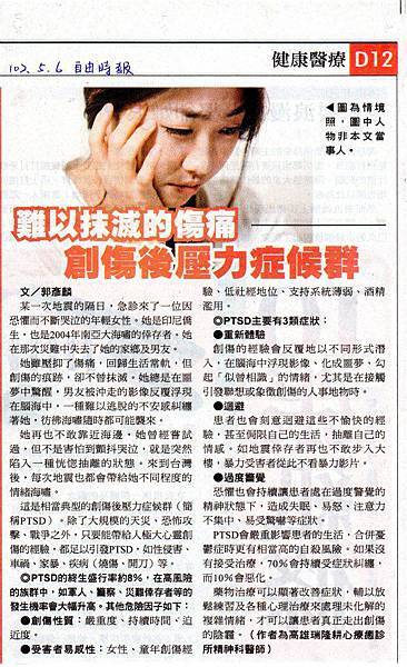 這是相當典型的創傷後壓力症候群(post-traumatic stress disorder, PTSD)。除了大規模的天災、恐怖攻擊、戰爭等之外,只要能帶給人極大心靈創傷的經驗,都足以引發PTSD,如性侵害、車禍、家暴、疾病(燒傷、開刀)等。